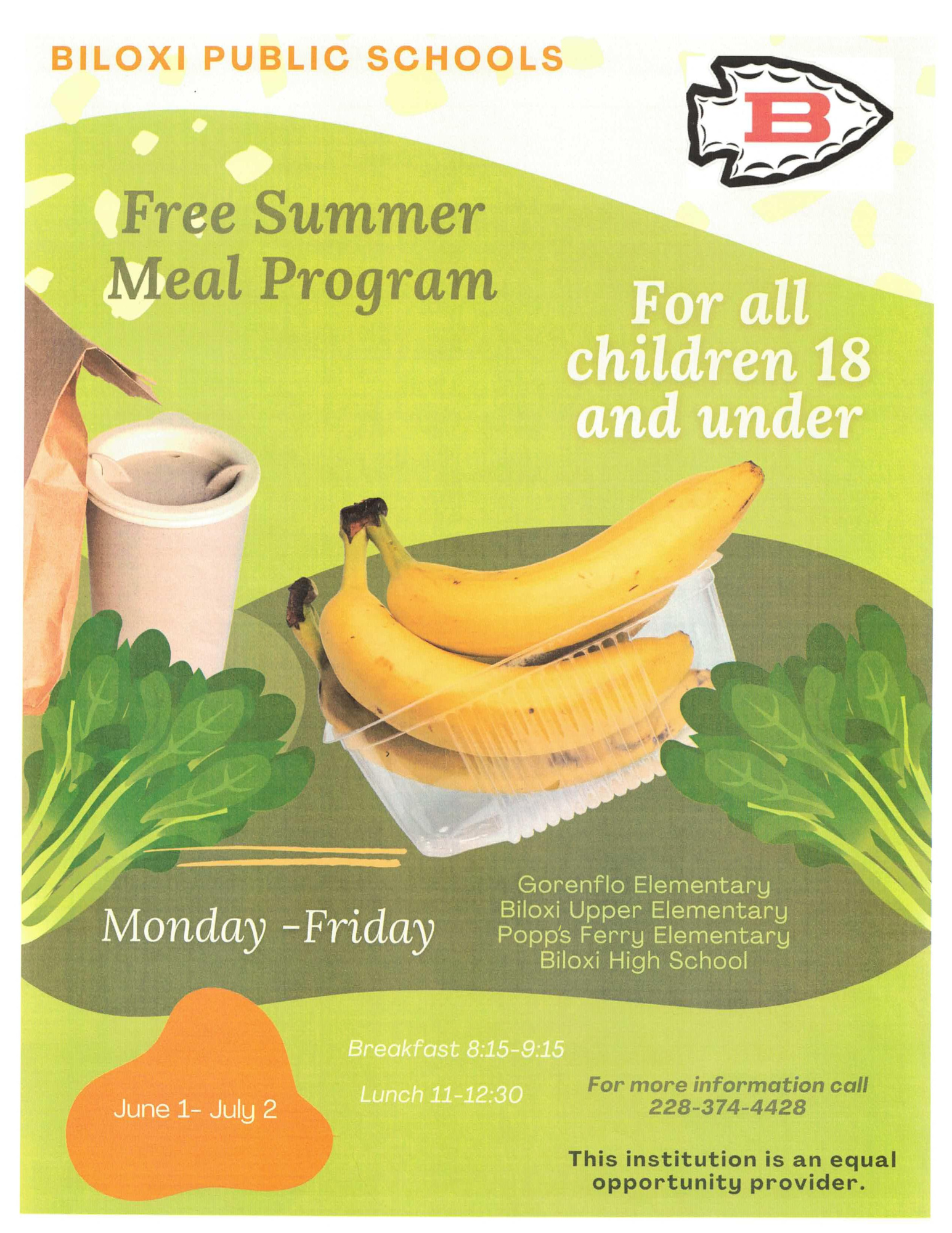 Our Free Summer Meal program will run from June 1 - July 2 at the following locations: Gorenflo ElementaryBiloxi Upper ElementaryPopp's Ferry ElementaryBiloxi High School Breakfast: 8:15 am - 9:15 ...
