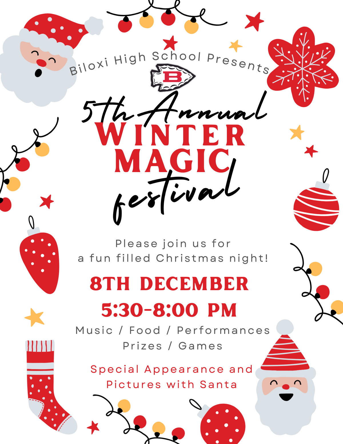 We hope you'll join us for the 5th Annual Winter Magic Festival. Activities will take place in the Biloxi High courtyard and all are welcome!